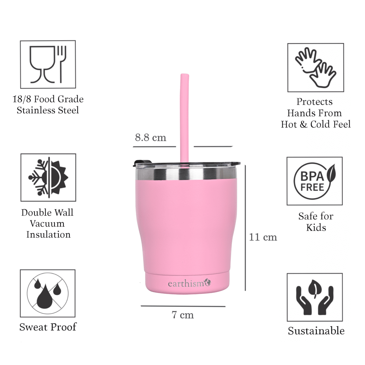• The Earthism Kids Tumbler Cup 300 Ml (10 oz) is made of 18/8 food-grade premium stainless steel. It’s completely safe your little munchkin- BPA Free, 100% Safe, Unbreakable, Reusable, No sharp edges and is Eco-friendly