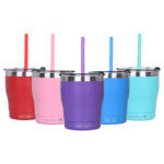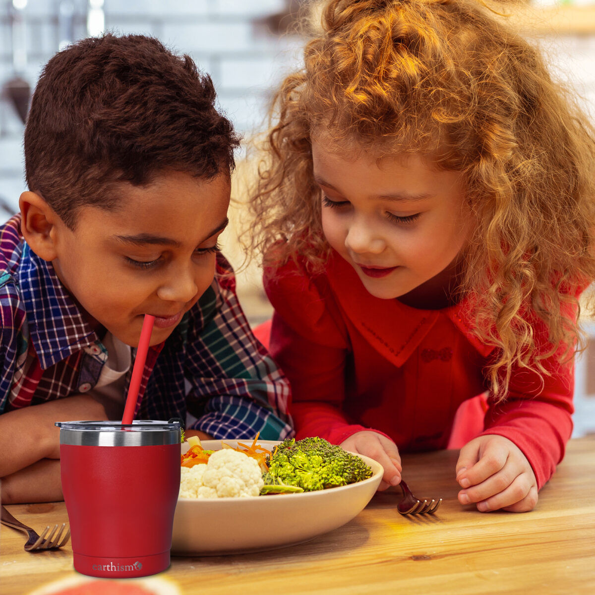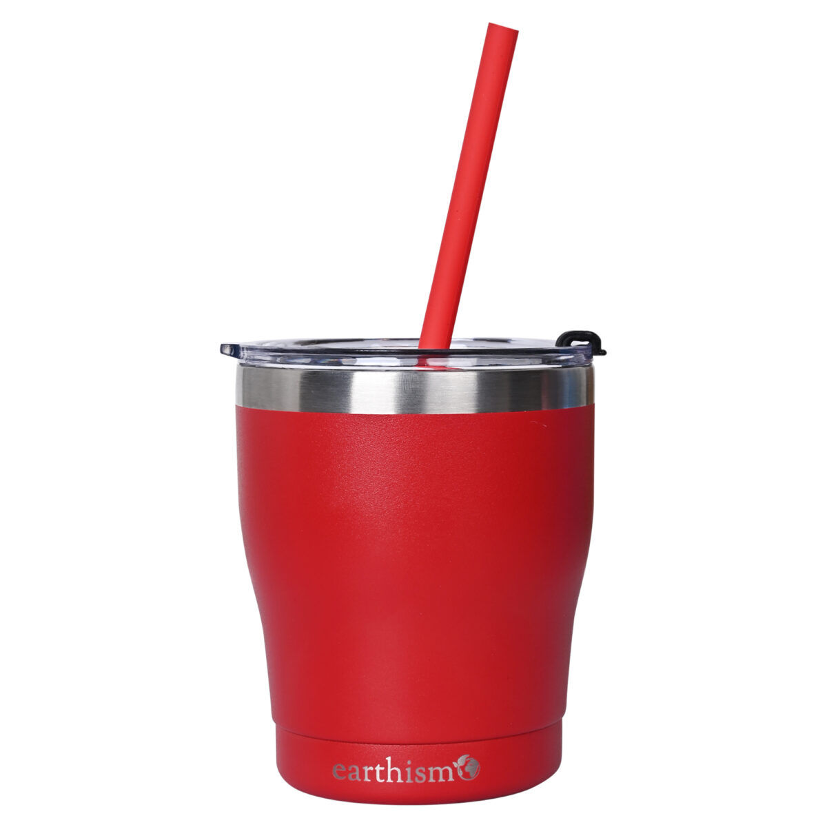 Earthism colorful kids tumblers are made of 18/8 food-grade stainless steel and have double-walled vacuum insulation; which means that the beverage will stay hot or cold for a long time. The size of the cup is perfectly suitable for tiny hands. They come in a variety of vibrant colors, and with a safe, soft silicone straw. Go-on, choose your favourite one!