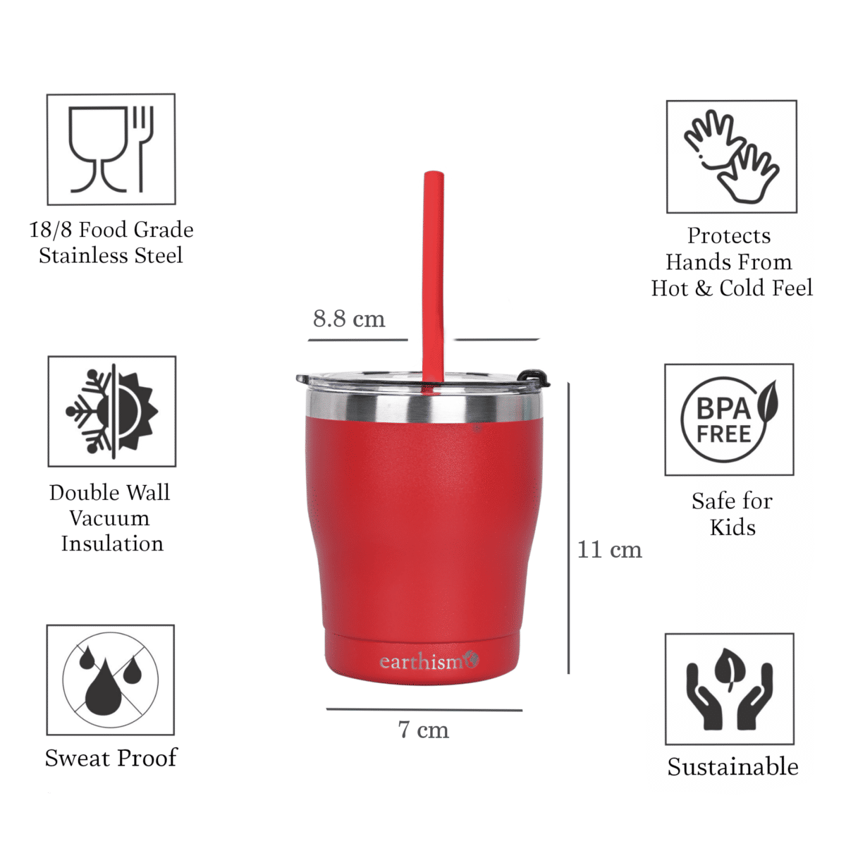 - The Earthism Kids Tumbler Cup 300 Ml (10 oz) is made of 18/8 food-grade premium stainless steel. It’s completely safe your little munchkin- BPA Free, 100% Safe, Unbreakable, Reusable, No sharp edges and is Eco-friendly