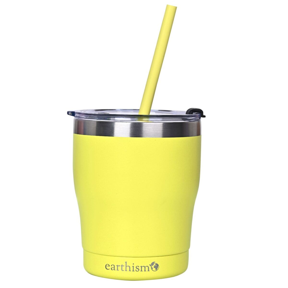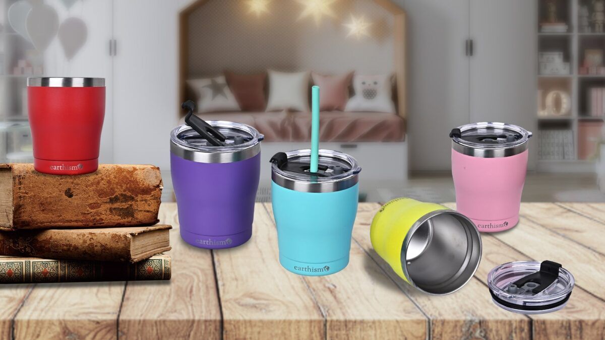 Earthism colorful kids tumblers are made of 18/8 food-grade stainless steel and have double-walled vacuum insulation; which means that the beverage will stay hot or cold for a long time. The size of the cup is perfectly suitable for tiny hands. They come in a variety of vibrant colors, and with a safe, soft silicone straw. Go-on, choose your favourite one!