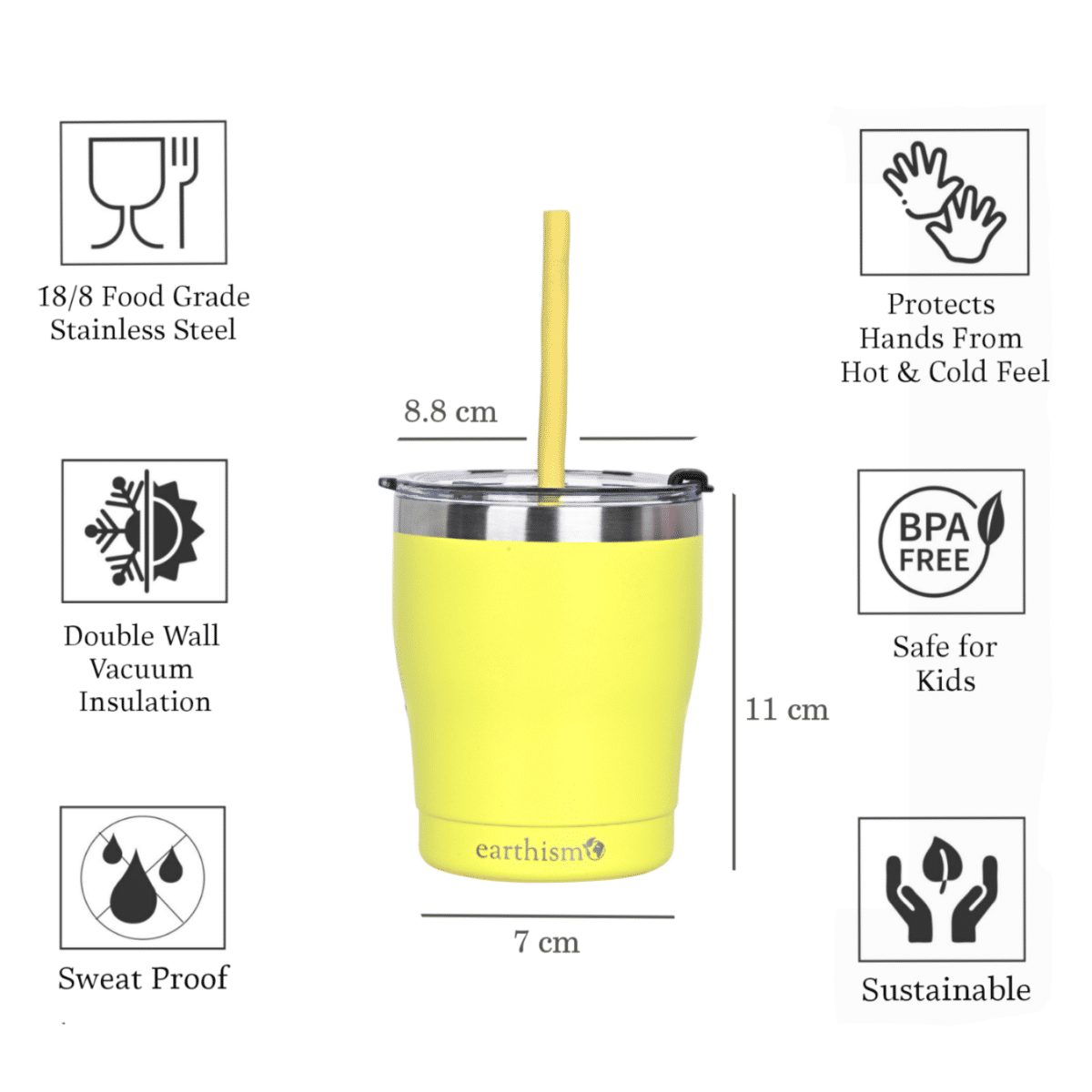 • The Earthism Kids Tumbler Cup 300 Ml (10 oz) is made of 18/8 food-grade premium stainless steel. It’s completely safe your little munchkin- BPA Free, 100% Safe, Unbreakable, Reusable, No sharp edges and is Eco-friendly