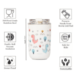 • Double-Walled Vacuum Insulation retains the temperature of the beverage for a long time. It’s sweat-proof, and prevents those tiny hands from feeling the heat/ chill