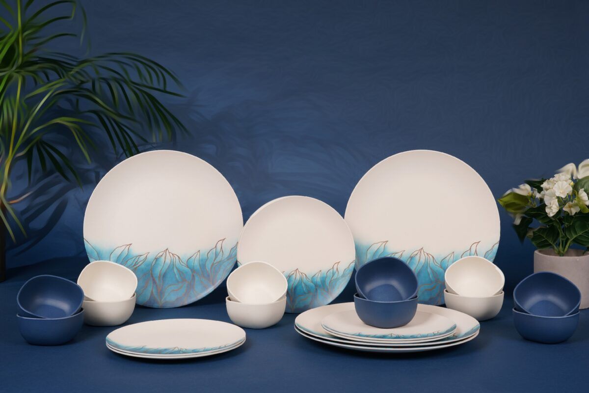 • Eco-Friendly Bamboo Fibre Dinnerware Set – Pack of 24 (Azure, Beige & Blue)